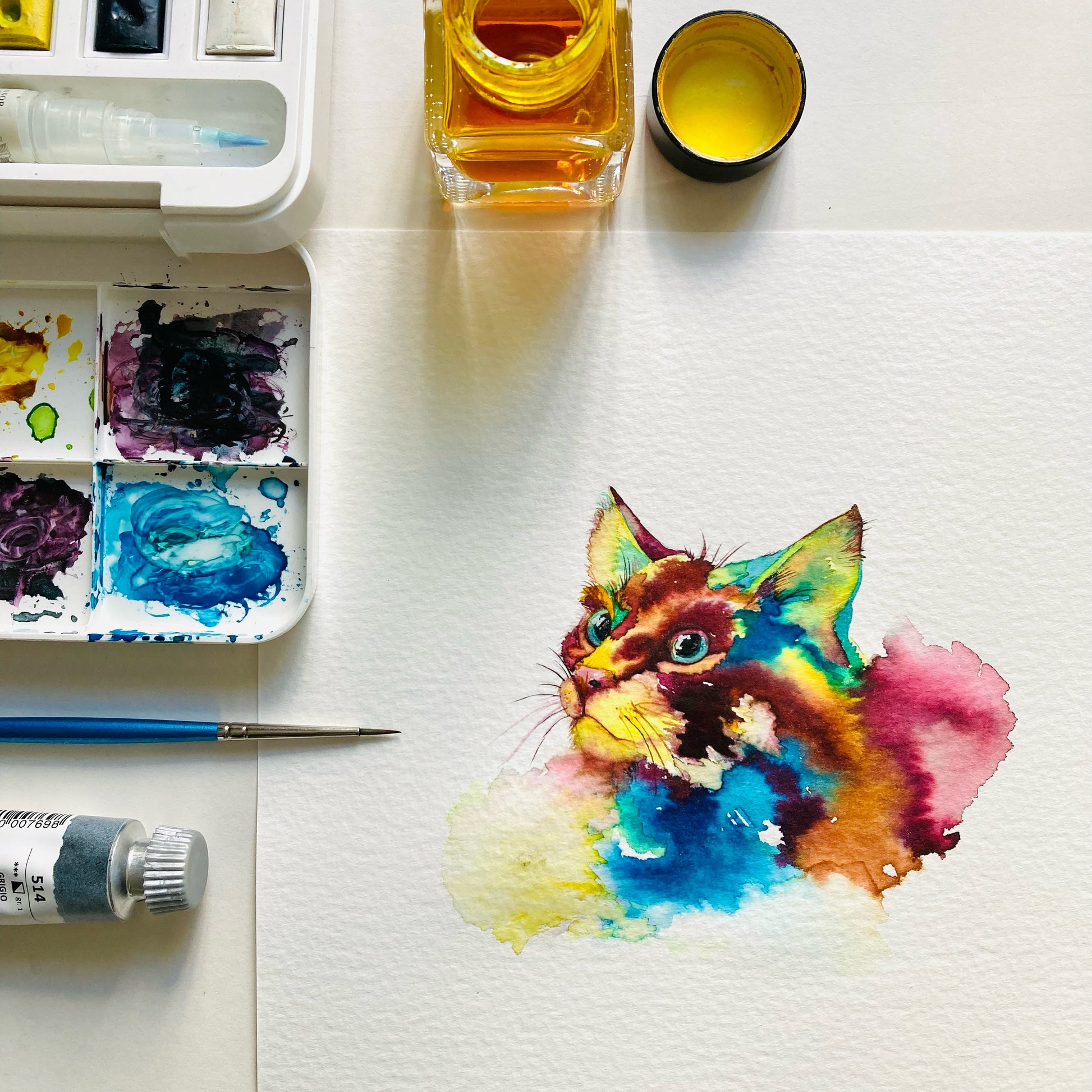 This brightly coloured cat painting is an original artwork painted using layers of Concentrated Watercolour Paint & Ink, all rights are retained by Kate Mac Art.